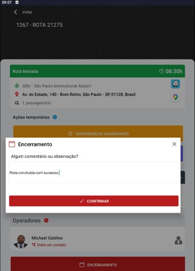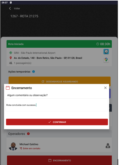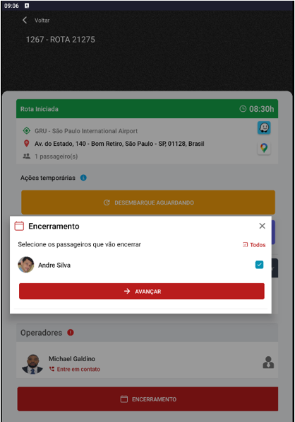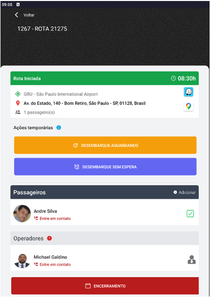 No aplicativo mobile, selecione "Encerramento" ao desembarcar o viajante.