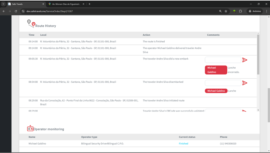 Os status do operador e do viajante serão exibidos como 'Finished' para indicar que a operação foi finalizada e 'Delivered' para confirmar que o viajante chegou ao seu destino."