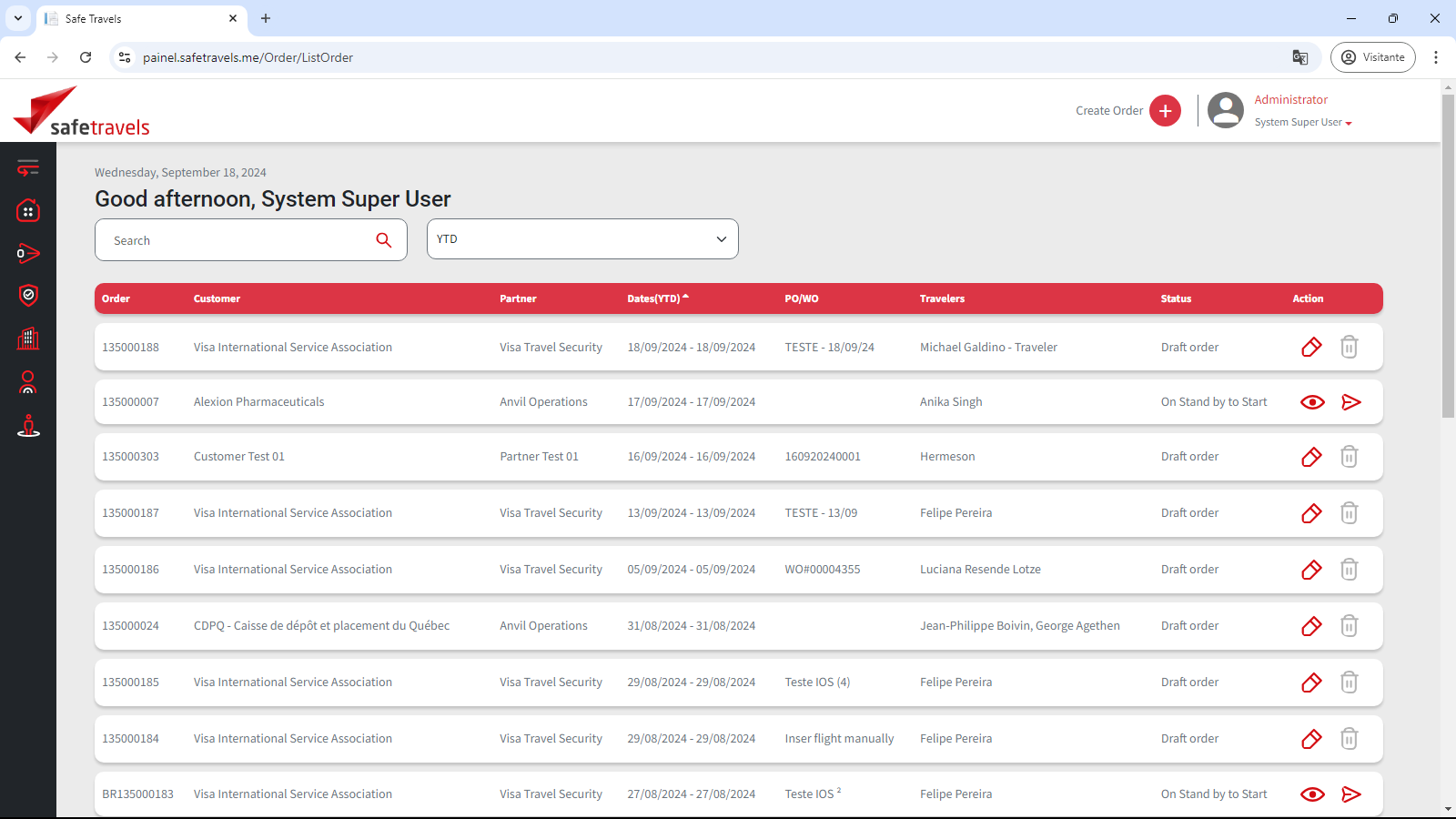 Clicando em “All my orders” no menu de perfil, podem ser visualizadas todas as ordens relacionadas ao usuário logado, para praticidade de acompanhamento. As mesmas podem ser encontradas pela pesquisa, ordenadas pelos seus dados e também editadas (vide item - Menu Lateral).